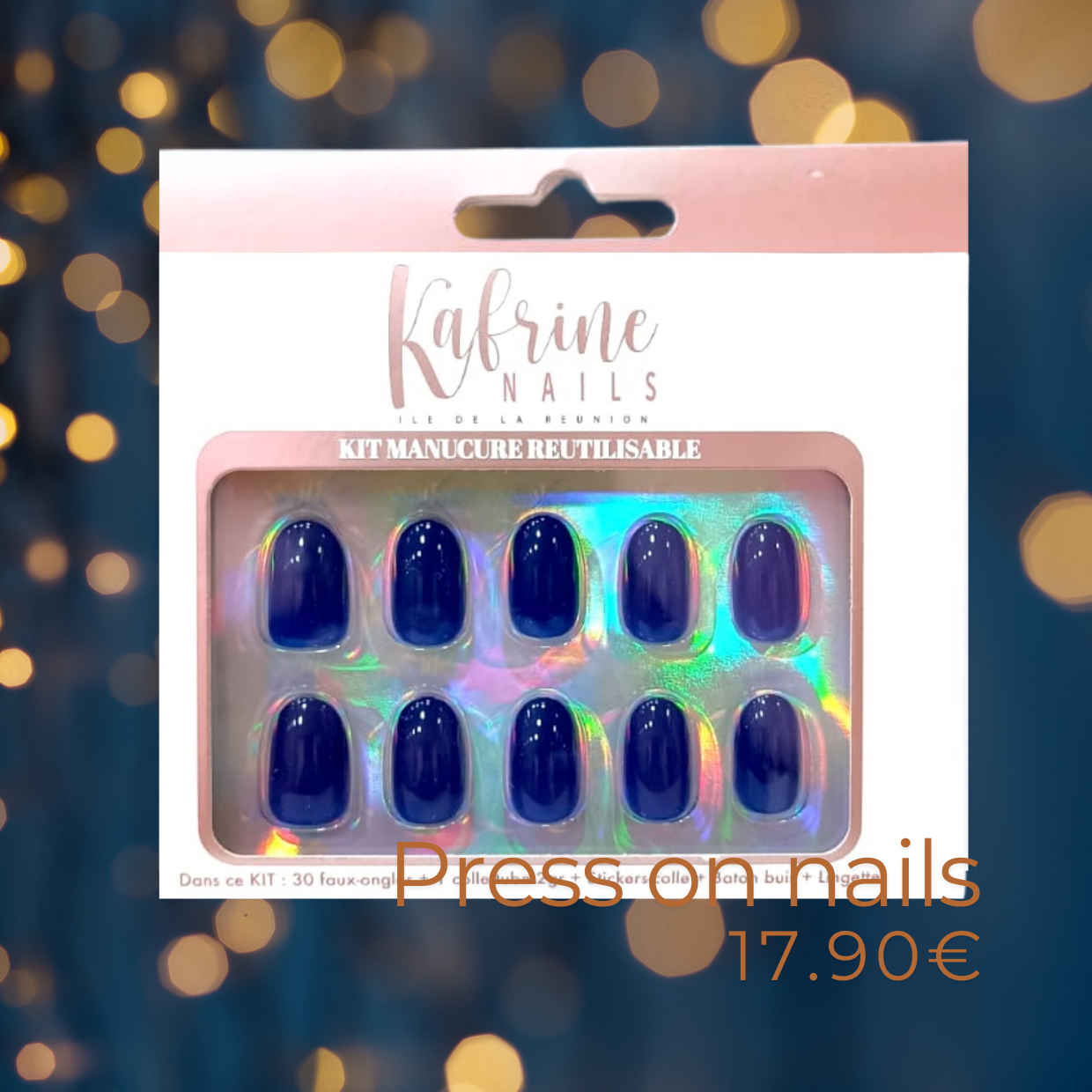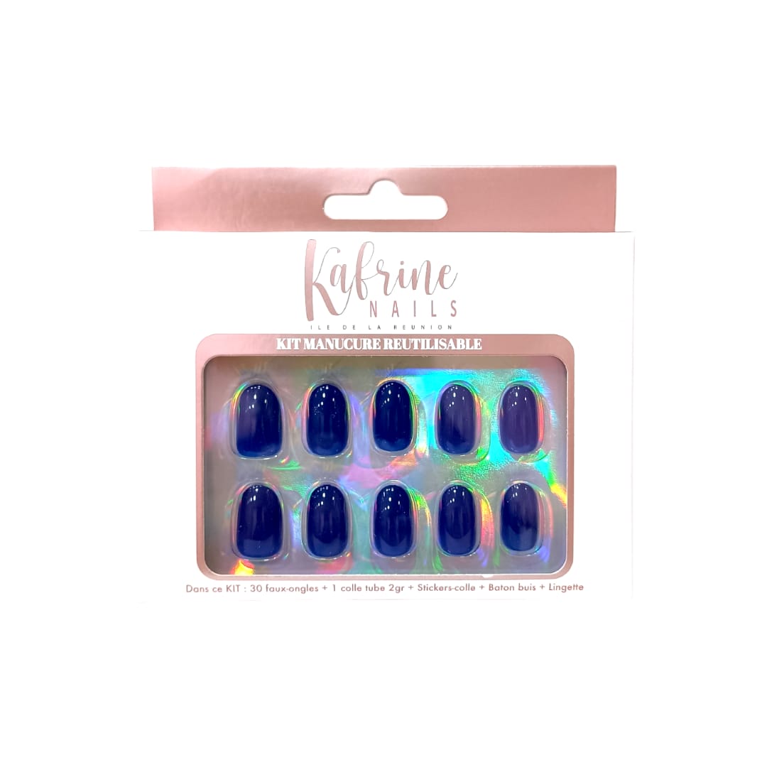 Boite de press-on nails : 30 capsules rondes bleues, colle liquide, stickers colle à poser soi même, lingettes, bâtonnet. Pose facile et rapide !