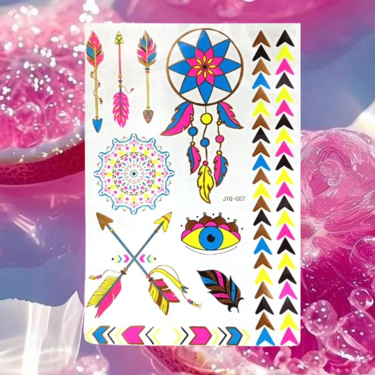 Tatouage rose/bleu/jaune fluorescent au contact des lumières ultraviolet. Motif rêve. Facile d’utilisation, choissez l’endroit ou l’appliquer, couper au plus près les contours du tattouage, coller et retirer la partie papier blanche, appliquer une eponge humide pour faire transférer le motif sur le peau pendant minimum 30secondes.